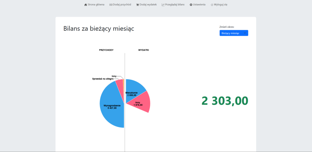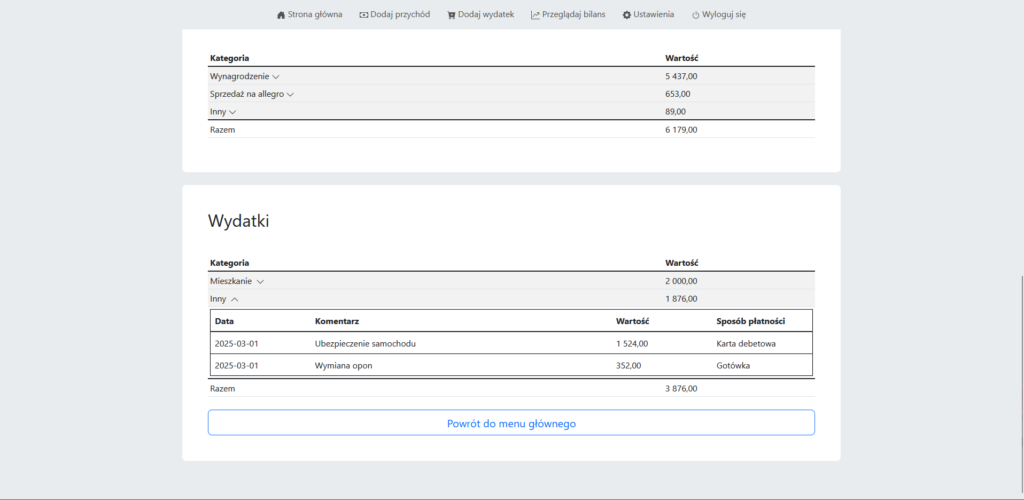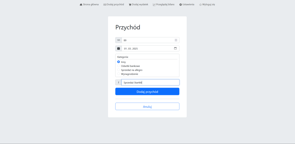 - Dodawać nowe przychody i wydatki,